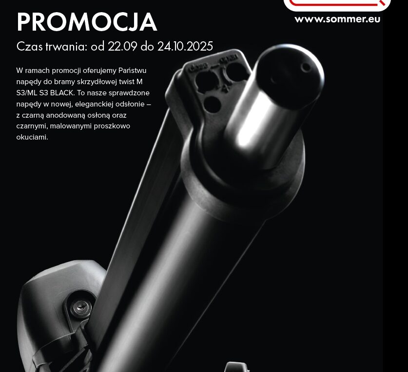 Do 24.10.2025 [lub do wyczerpania zapasów] trwa super promocja na nasze najpopularniejsze napędy do bram skrzydłowych, w ekskluzywnej wersji BLACK. Zestawy Sommer Twist M z montażem już od 3350,00zł, zapraszamy do kontaktu!